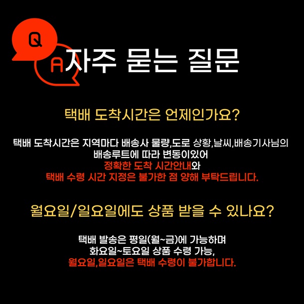 · 구매자가 배송지 주소를 잘못 기입한 경우, 반송/재발송 모두 택배비를 부담하셔야 합니다. (꼭 정확한 주소를 기입해 주세요)